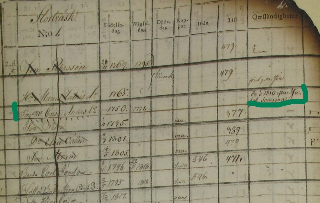 Bild: Kyrkbok fr 1818-1826 där hustrun till första inflyttaren (Jakob Svensson) bor i Storträsk Nr 1 och att hon där blivit änka år 1810. Storträsk upptar 2 sidor i kyrkboken. Andersträsk följer på efterföljande sida med 16 personer, varav 2 dött under angiven period.